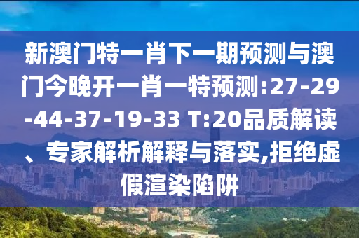 摘要:針對(duì)新澳門特一肖下一期的預(yù)測(cè)以及澳門今晚開一肖一特的預(yù)測(cè),經(jīng)過(guò)品質(zhì)解讀和專家解析,涉及號(hào)碼27-29-44-37-19-33以及T:20。提醒公眾理性對(duì)待,拒絕虛假渲染陷阱,以落實(shí)真實(shí)可信的解析和預(yù)測(cè)。
