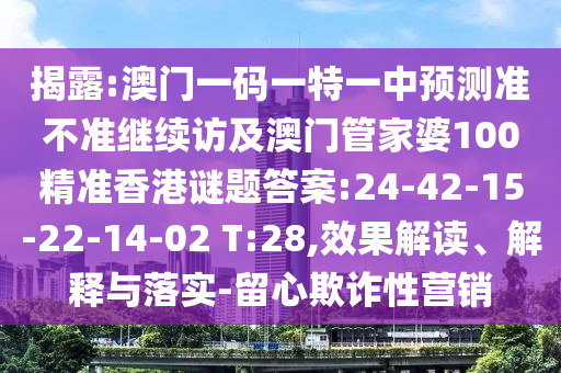 摘要:揭露澳門一碼一特一中預測的準確性存疑,需警惕欺詐性營銷。對于澳門管家婆提供的精準香港謎題答案,包括數(shù)字24-42-15等,應謹慎對待。建議關注官方渠道和可靠信息來源以獲取真實有效的預測結果,避免陷入騙局。對于任何預測結果,都需要理性看待,不可盲目相信。