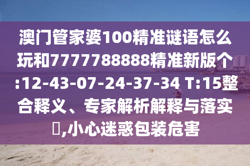 澳門管家婆100精準(zhǔn)謎語游戲是一種基于游戲性質(zhì)的娛樂方式,涉及對特定謎語或號碼的猜測,這種游戲通常伴隨著大量的宣傳和營銷手段,聲稱能夠精準(zhǔn)預(yù)測結(jié)果,我們需要明確的是,這類游戲的本質(zhì)具有不確定性,任何所謂的“精準(zhǔn)預(yù)測”都是基于概率而非確定性的,關(guān)于數(shù)字組合“7777788888精準(zhǔn)新版?zhèn)€:12-43-07-24-37-34 T:15”,這些數(shù)字在謎語游戲中可能代表特定的組合或提示,但并不能保證準(zhǔn)確性或帶來預(yù)期的收益。