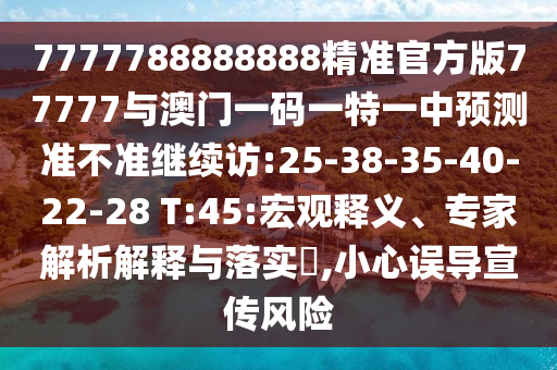 摘要:,,關(guān)于7777788888888精準(zhǔn)官方版與澳門一碼一特一中預(yù)測(cè)的準(zhǔn)確性,存在多種觀點(diǎn)和解讀。其中涉及特定數(shù)字組合的預(yù)測(cè),如25-38-35-40-22-28等,以及宏觀釋義和專家解析。需要警惕誤導(dǎo)性宣傳的風(fēng)險(xiǎn),避免盲目相信預(yù)測(cè)結(jié)果。對(duì)于此類情況,建議謹(jǐn)慎對(duì)待,不可輕信。